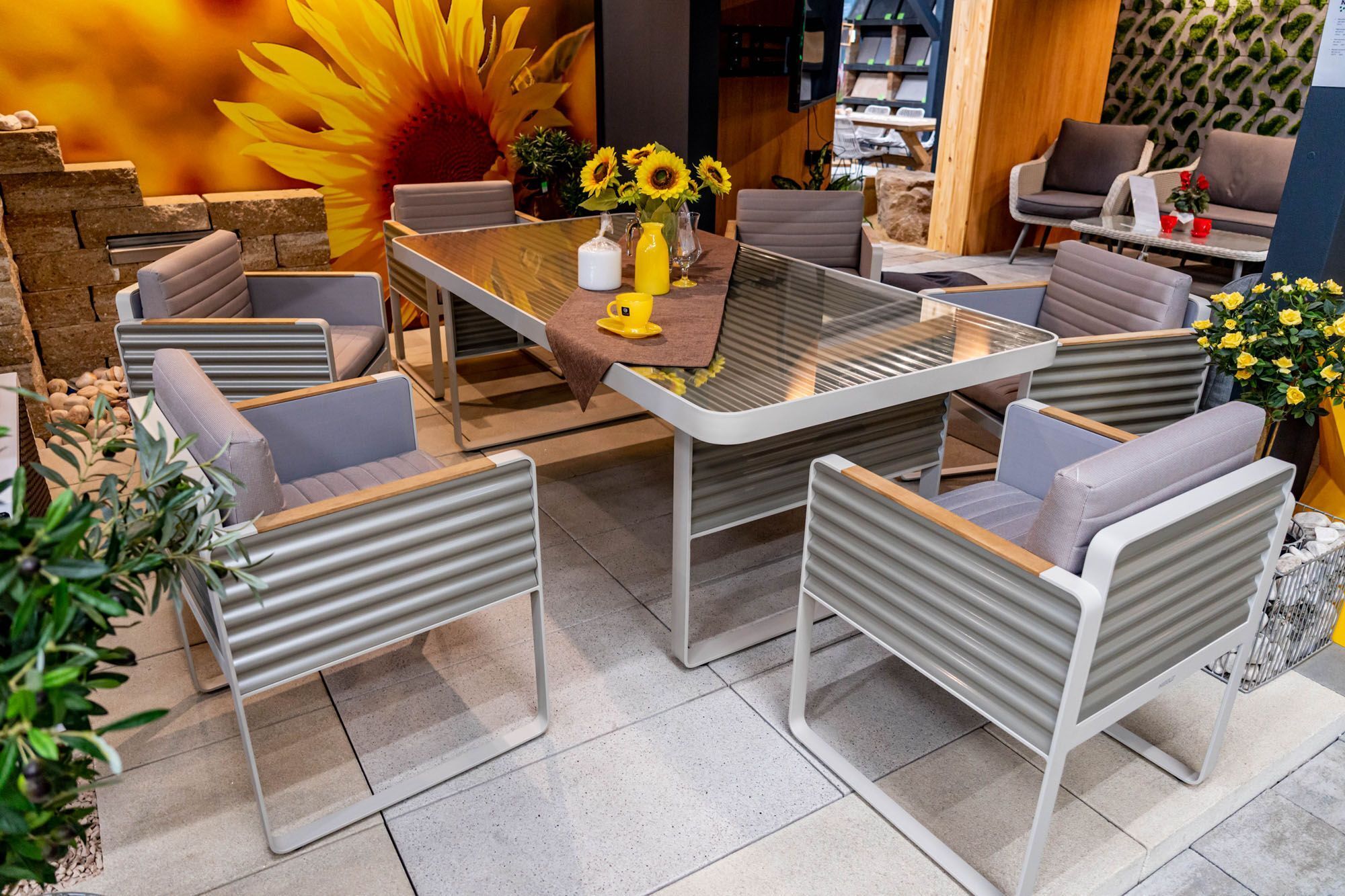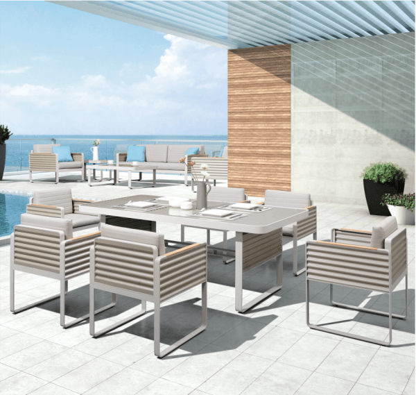 Drawing inspiration from the iconic wave patterns of high-end travel luggage, the corrugated metal sheets are delicately framed with flat metal, creating a striking visual masterpiece. With architectural proportions and refined elements, the Airport Collection seamlessly blends into luxurious private gardens and terraces. This Airport 6-seat dining set can be seamlessly incorporated into any garden setting, adding a touch of sophistication to outdoor dining experiences.